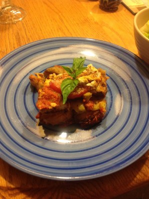 Fortunately, I live in Boulder, CO: the land of dietary restrictions including veganism, gluten-free, and granola-loving hipsters. It wasn’t hard to find some help. A vegetarian co-worker, formerly a strict vegan, had a stash of favorite vegan recipes that he shared with me. One of his favorites was a Rustic Bread and Eggplant Lasagna. It has layers of tomato sauce, but instead of noodles in between, there’s sourdough bread, and instead of meat and cheese, you’ll find roasted eggplant. Topped with breadcrumbs and fresh basil, it was a beautiful and tasty dish.