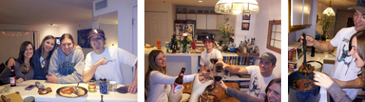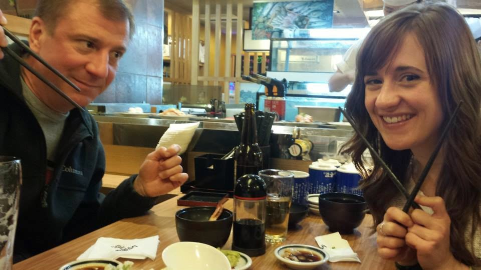 | Left to right: Dad and I with the baked flounder; Mom wrapping sushi in lettuce leaves to dip in sauce. |