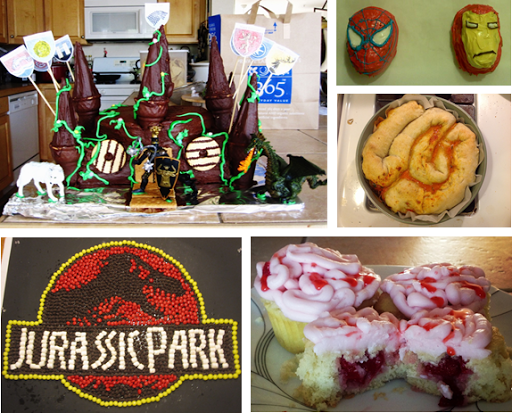 | Clockwise from top left: The Game of Thrones birthday cake, Spiderman and Iron Man cupcakes, The Walking Dead pastry “intestines” and “brain” cupcakes, and the Jurassic Park logo of candy. |