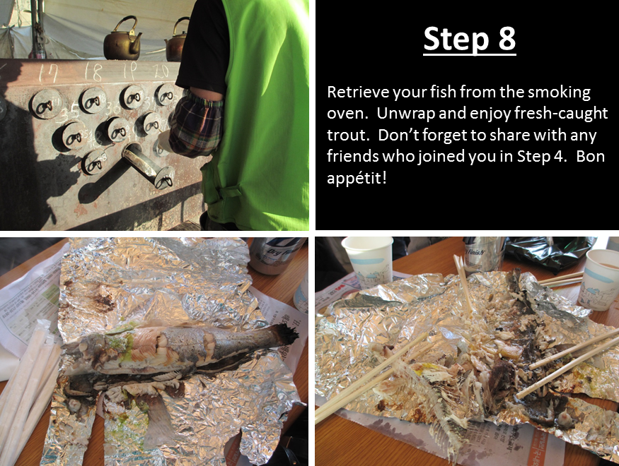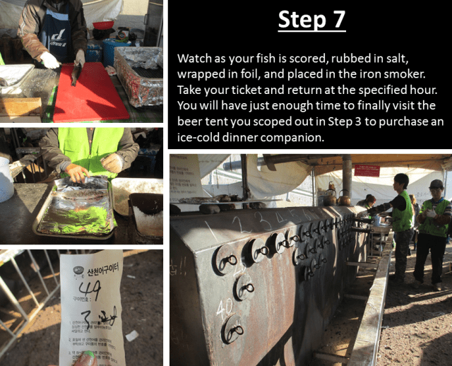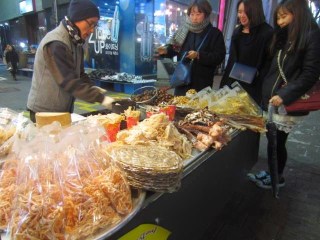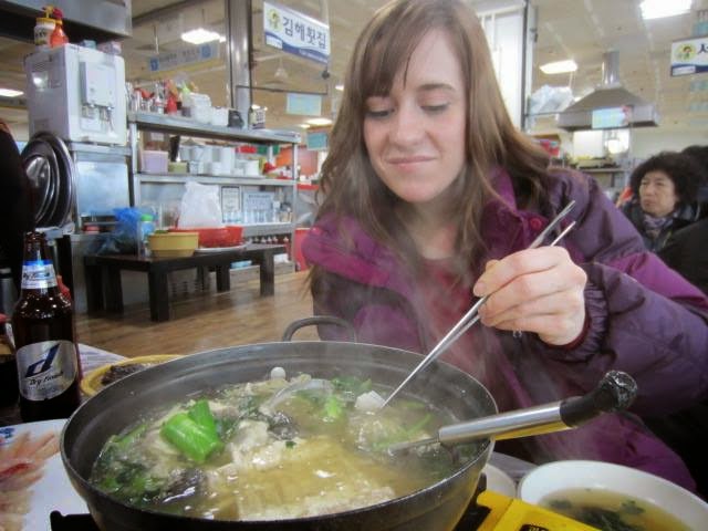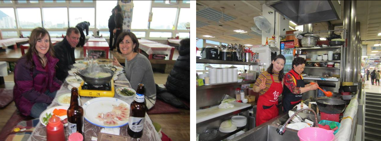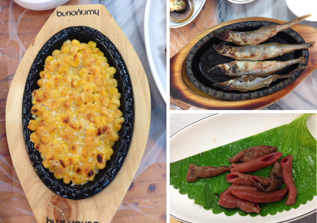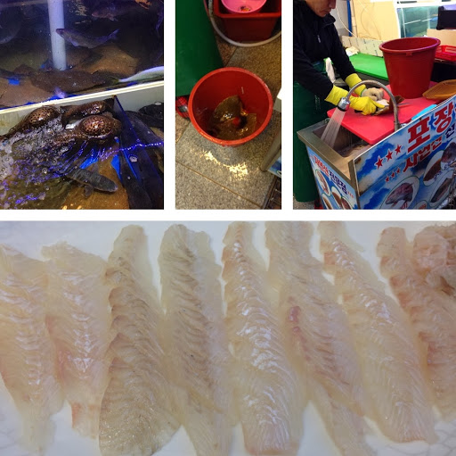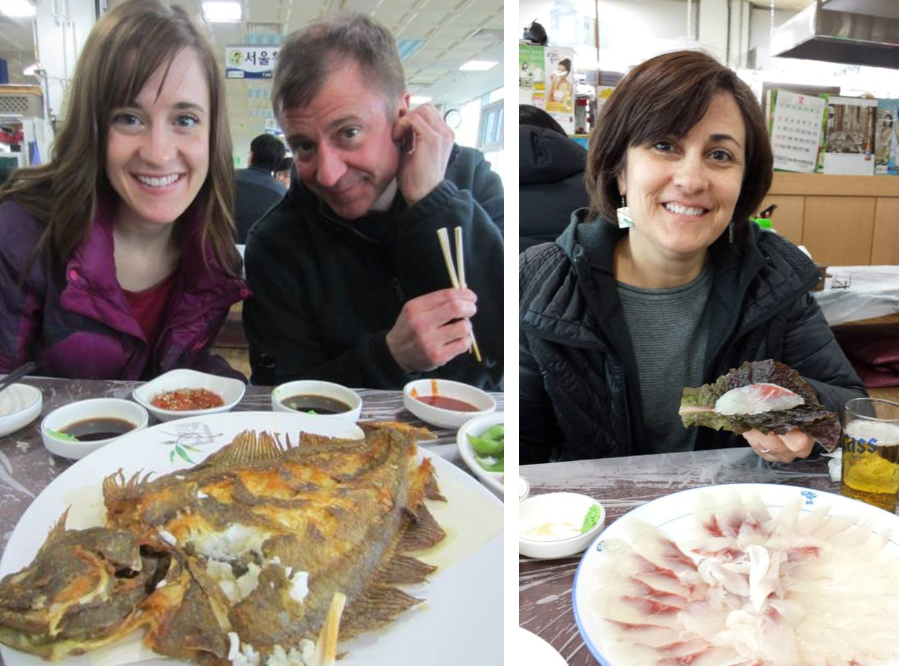 When we entered the simple restaurant, we saw many large tanks of “ice fish” which we soon realized were tiny smelt. Immediately after sitting down, we learned of the locals’ favorite smelt preparation: raw. Not sushi raw. Raw as in: “Here’s your bowl of live, swimming fish and some chopsticks. Good luck.” We watched in shock as Koreans struggled to contain their active fish bowls (picture a lot of splashing and escaping fish). While some diners seemed a little amused with their lively meals, most were unperturbed and hungrily speared (mad chopstick skills), dipped in spicy sauce, and swallowed.