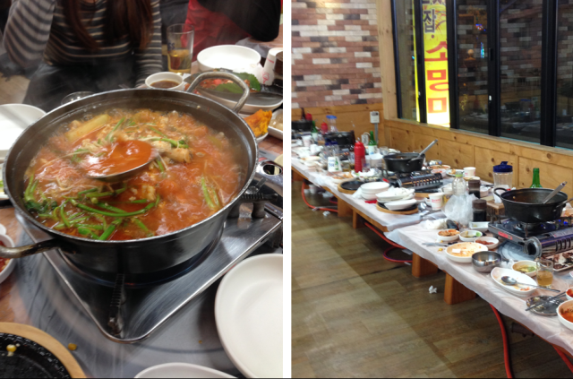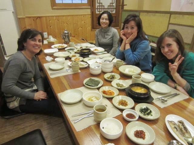Our aching legs welcomed a modernized panchan restaurant where we were seated in chairs at a table with my English co-teachers and program coordinator. The number of side dishes at our table would have taken a server ages to unload, but this place had an ingenious delivering method: a tabletop full of panchan was wheeled in by a car and placed on top of our empty table.