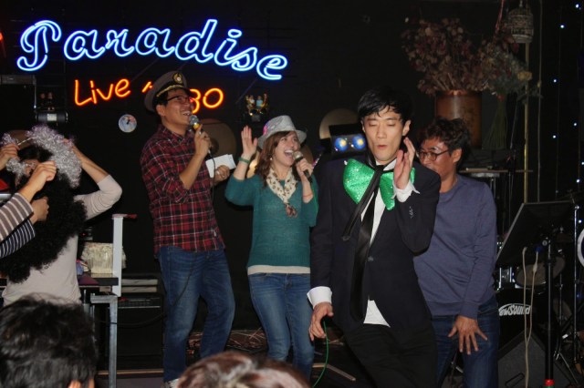 | Singing the only English song of the night: “Moves Like Jagger” by Maroon 5. |