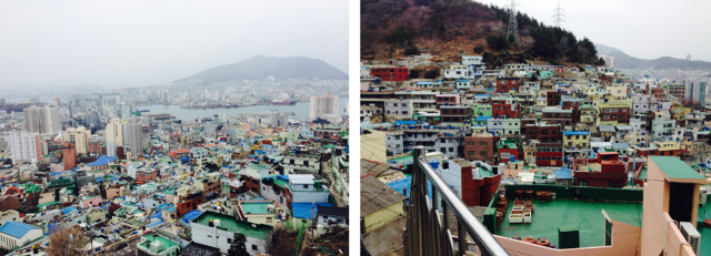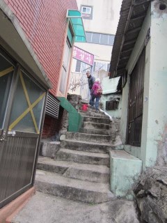 We wandered up and down the steep and narrow alleys of the Gamcheon until stumbling upon the “Happy Village.” Unbeknownst to us, the modern-looking building acted as a cultural welcoming center for immigrants to Korea from around Asia. We were the first Americans to enter the place and we were treated like royalty. We were quickly ushered in and invited to sit down by a more-than-thrilled Korean woman. She frantically started preparing coffee while yelling to someone upstairs. When a young Filipino woman clad in sweats and rubber gloves entered the room, she was as surprised as we were that the five of us were all in the same place at that moment.