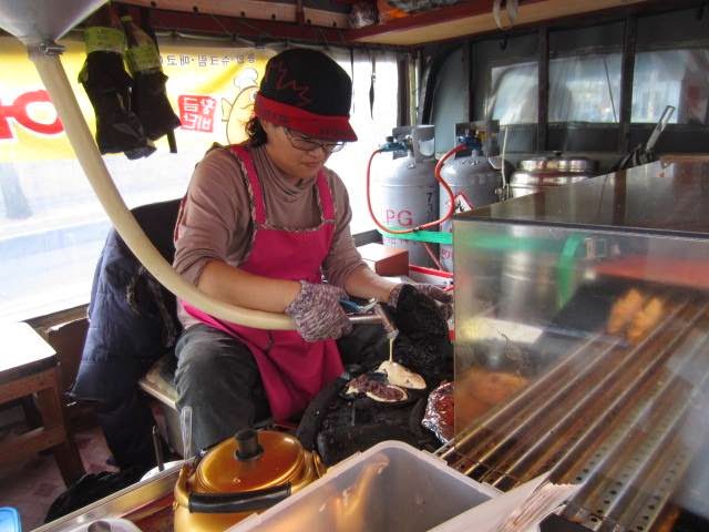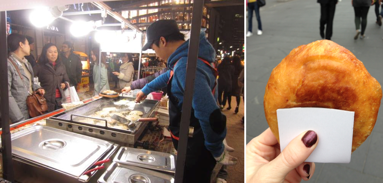 | My favorite wintertime specialty: hoddeok. It’s a crispy and chewy doughnut on the outside, with a gooey syrup made from brown sugar and nuts on the inside. Served hot off the fryer! |