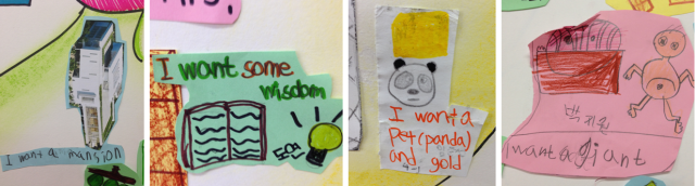| Left to right: “I want a mansion.”; “I want some wisdom.”; “I want a pet (panda) and gold.”; “I want a giant.” |