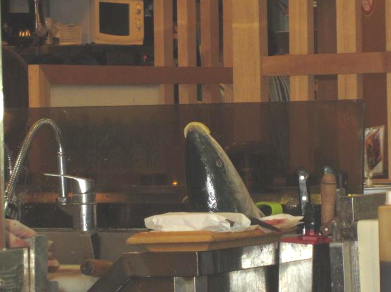 The tables of the restaurant were positioned around the open kitchen so we could watch as the chefs prepare the ingredients and present them beautifully before placing on the conveyor belt. Behind the chefs were tanks of giant fish we assumed they kept for our viewing pleasure, just a small reminder of where our food came from. We were about to get an augmented reality check.