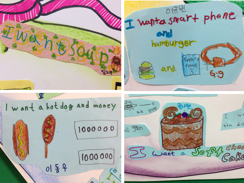 | Clockwise from top left: “I want soup.”; “I want a Smarphone and hamburger.”; “I want a hot dog and money.” ; “I want a soft chocolate cake.” |