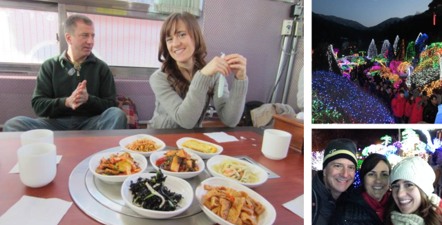 | Left: seven panchan that will accompany our main dish of marinated pork. Right: the beautiful lights decorating the Garden of Morning Calm in wintertime made us feel like it was Christmas. |