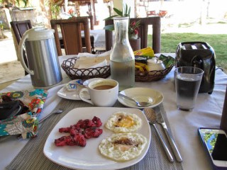 | Talima’s “Filipino Breakfast”: two eggs, tocina (sweet pork), coffee and toast. (Notice how they brought the toaster to my table? I could toast the bread at my convenience. Brilliant!) |