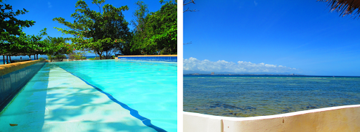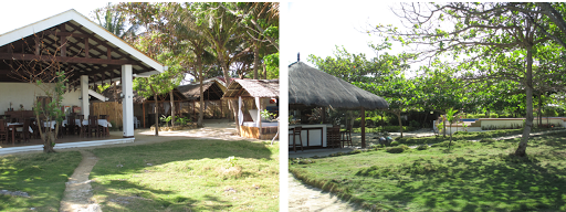 | Left: Talima’s restaurant and lounging huts; Right: the resort pool and bar. |